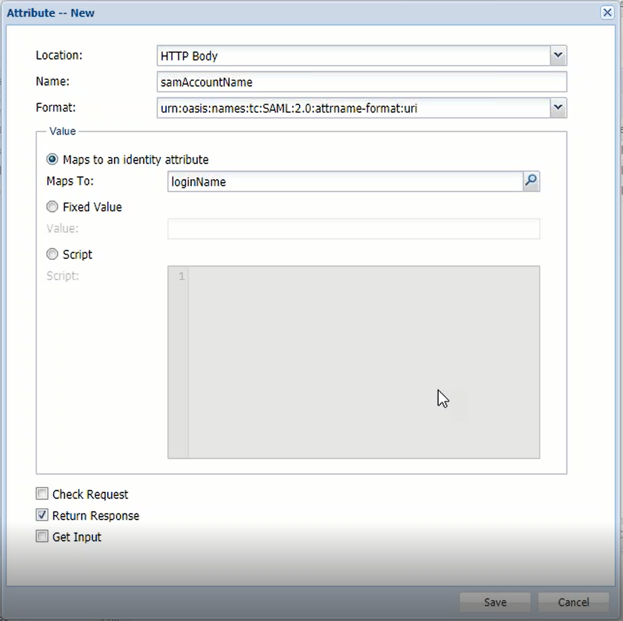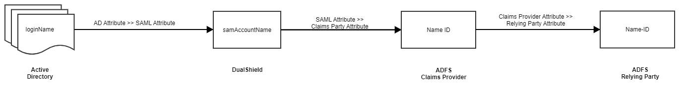 - AD Attribute → SAML Attribute: DualShield retrieves the user's login name, i.e. "loginName" attribute from AD, then returns it to ADFS as a SAML attribute. Let's call it "samAccountName"
