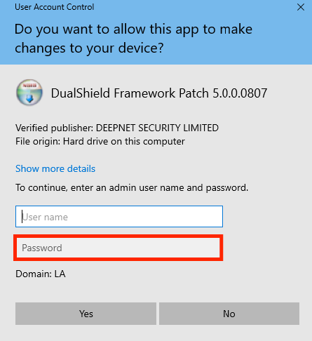 This, however, relies on the assumption that the end user does not know the administrator account credentials. If the user gains access to this information, it creates a significant security vulnerability within the network. Therefore, you can use DualShield to further protect the admin credentials by adding a second authentication step, just like you have for Computer Logon.