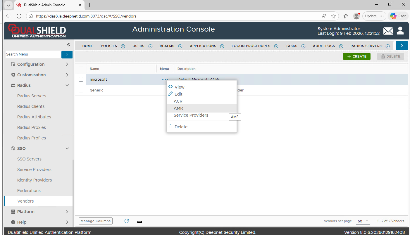 In DualShield Admin Console, navigate to SSO > Vendors..