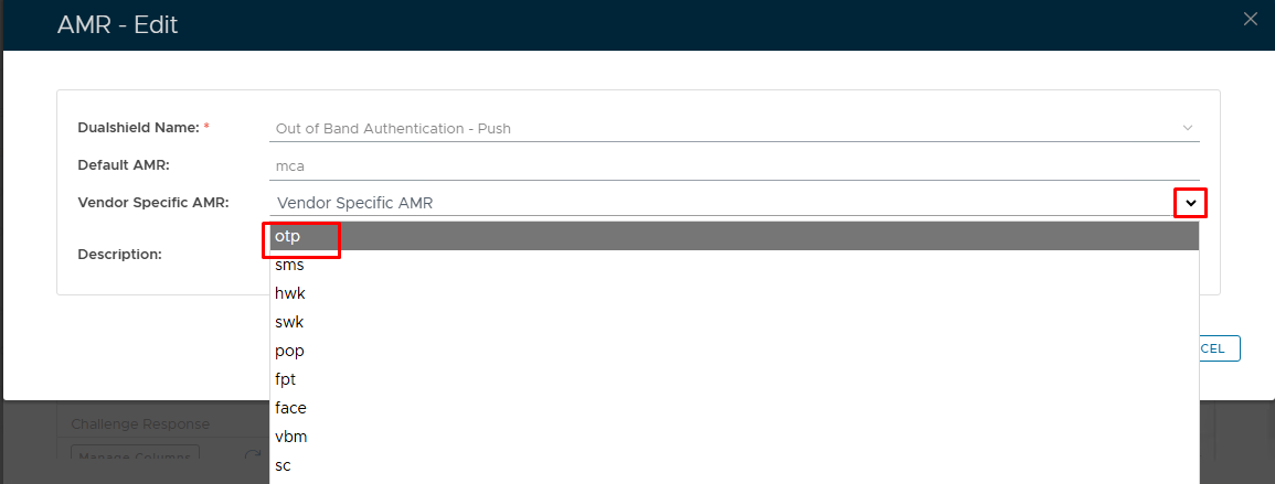 Click the down arrow to the right of the "Vendor Specific AMR" list and select "otp" from the list
