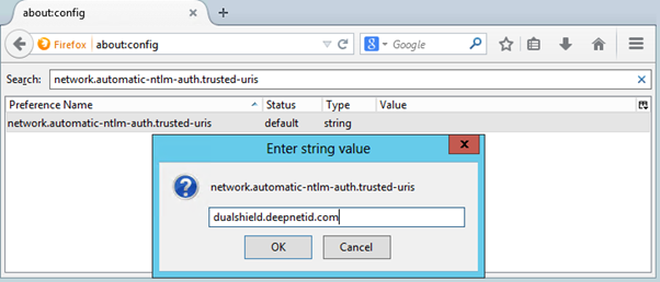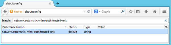 For the Firefox Browser, type "about:config" in the address bar, and search the "network.automatic-ntlm-auth.trusted-uris" on the "Search" field.
