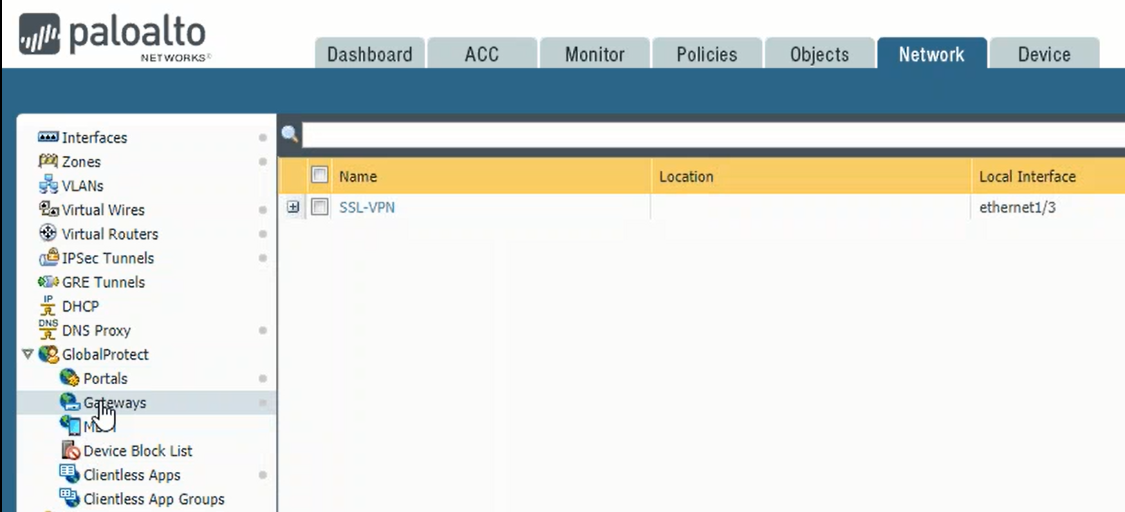 Click on your configured GlobalProtect gateway, e.g. SSL-VPN, to bring up the configuration window.