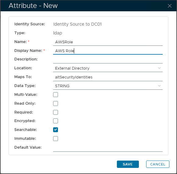 In this example, we're going to name the attribute as 'AWSRole', and we're going to map this attribute to an AD attribute called 'altSecurityIdentities'.