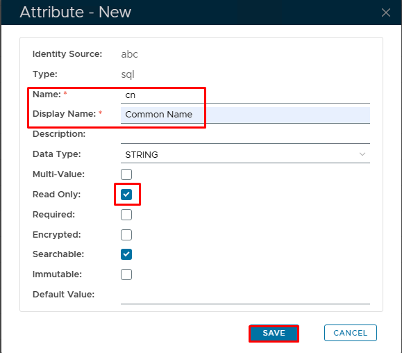 In the 'Attribute-New' Dialogue box, specify 'Name' as cn and 'Display Name' as Common Name