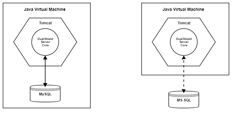 DualShield server uses a standard SQL server as its data store. By default, it includes an instance of MySQL server that's installed locally. Optionally, it can be configured to use an external SQL server that is remotely connected.