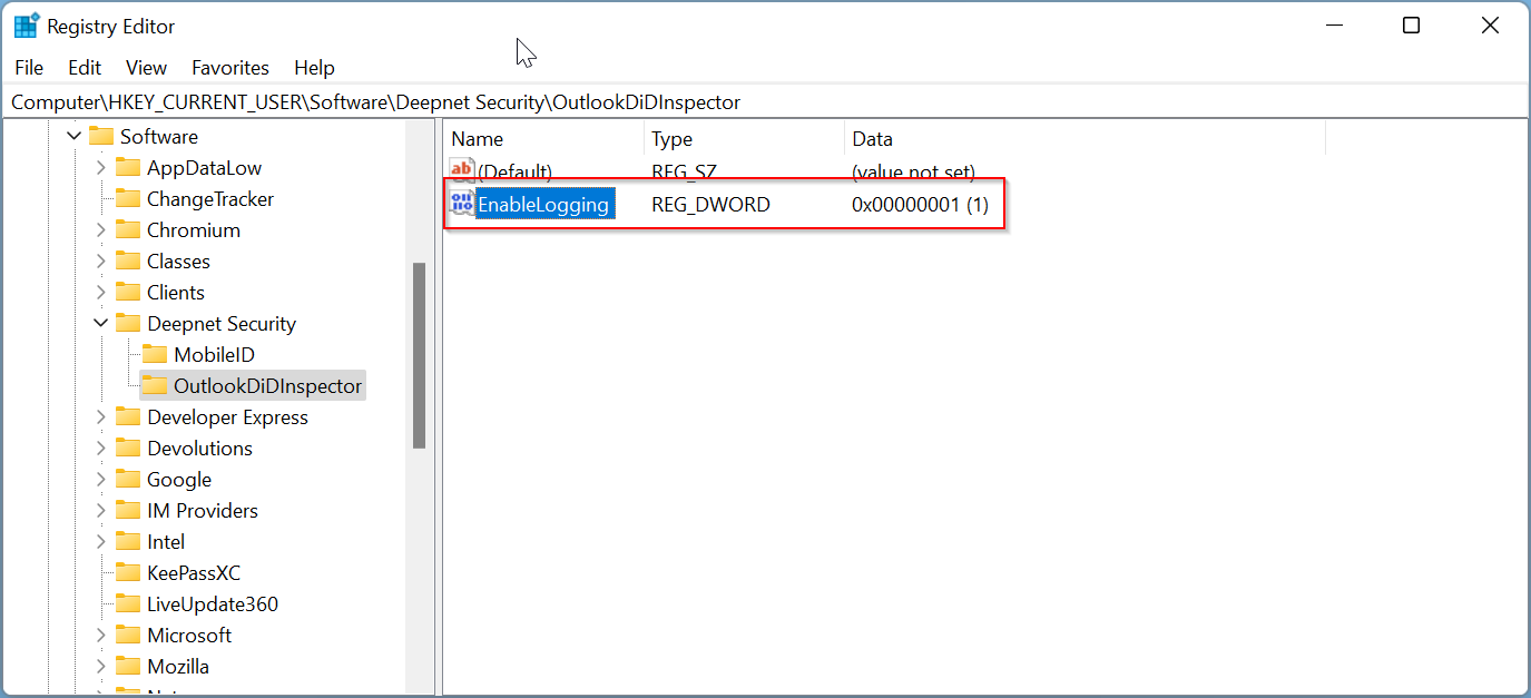 To enable the log function in the Outlook DeviceID Inspector, download the registry settings file below