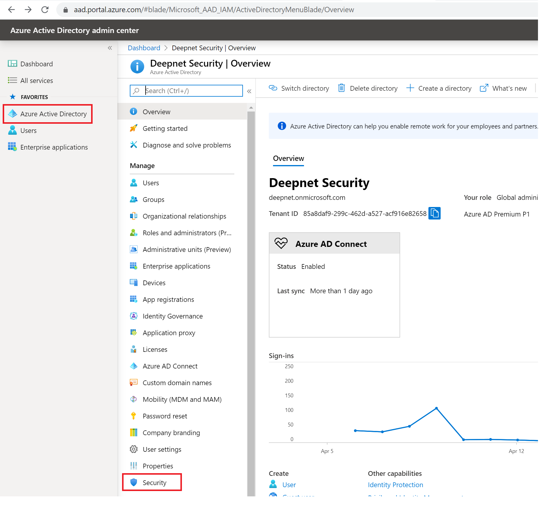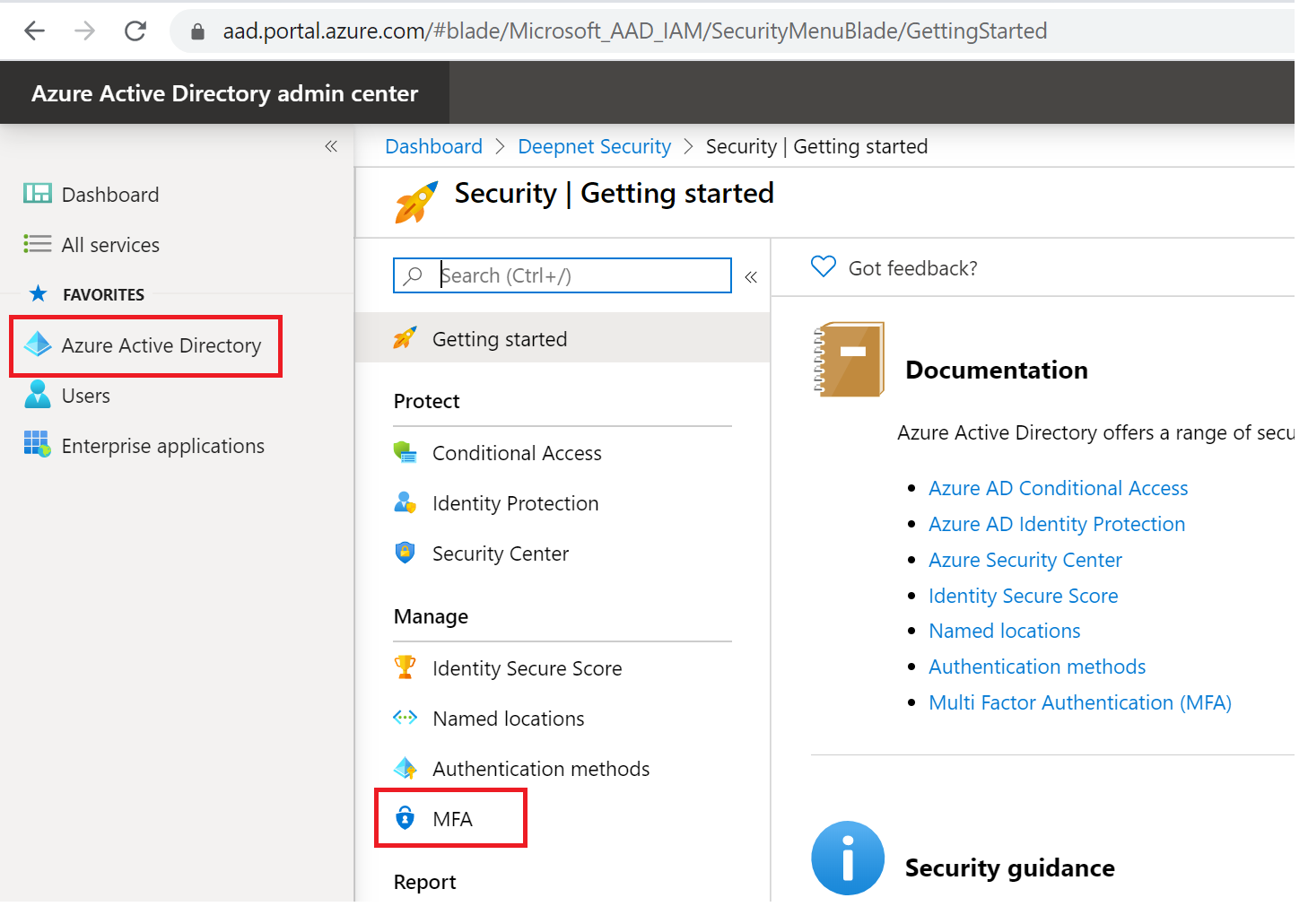 Now, sign in to the Azure portal and navigate to Azure Active Directory, then to Security and to MFA.