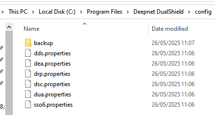 The corresponding property files are found under C:\Program Files\Deepnet DualShield\config on the DualShield hosting server. (If you are using a separate front-end machine, you will be editing the property files on that server)