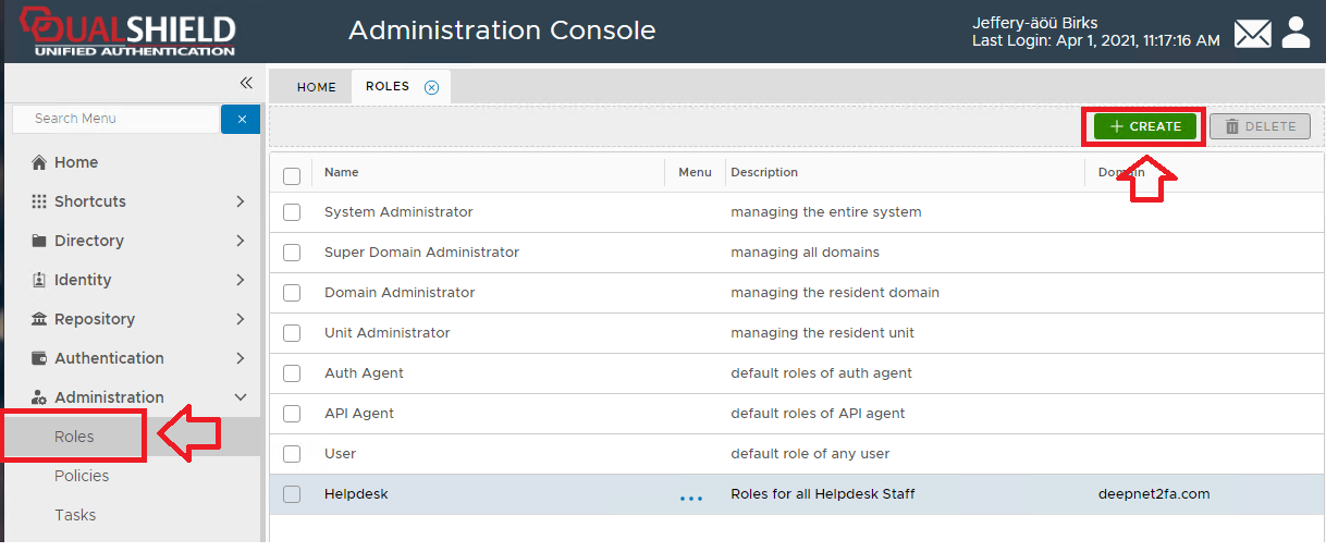 To create a Help Desk role, navigate to "Administration | Roles" in the main menu, then click "+ Create";