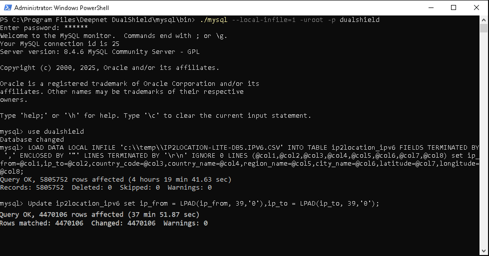 If your DualShield is using a MySQL database, follow the steps below to import "IP2LOCATION-LITE-DB5.IPV6.CSV"
