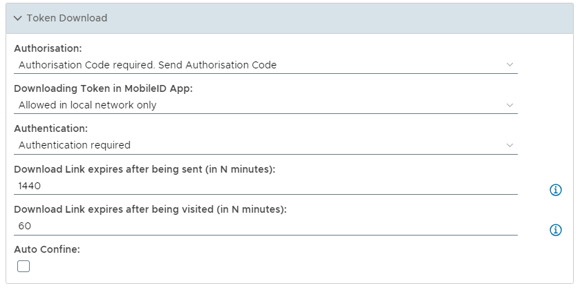 The MobileID policy settings "Authorisation" and "Authentication" affect what the user must do prior to downloading a token, whist the download link expiry settings determine how long the links remain viable.