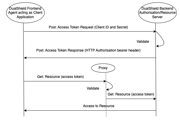 The client application (DS Frontend agent) requests an access token. To receive this token, the client posts an API call to the authorisation server (DualShield Backend). This API call will include values of the Client ID and Client Secret.