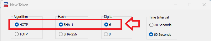 3. Press the button, select Algorithm "HOTP", Hash "SHA-1" and Digits "6" (Since we are selecting the "HOTP" algorithm, then we do not need to specify the time interval);