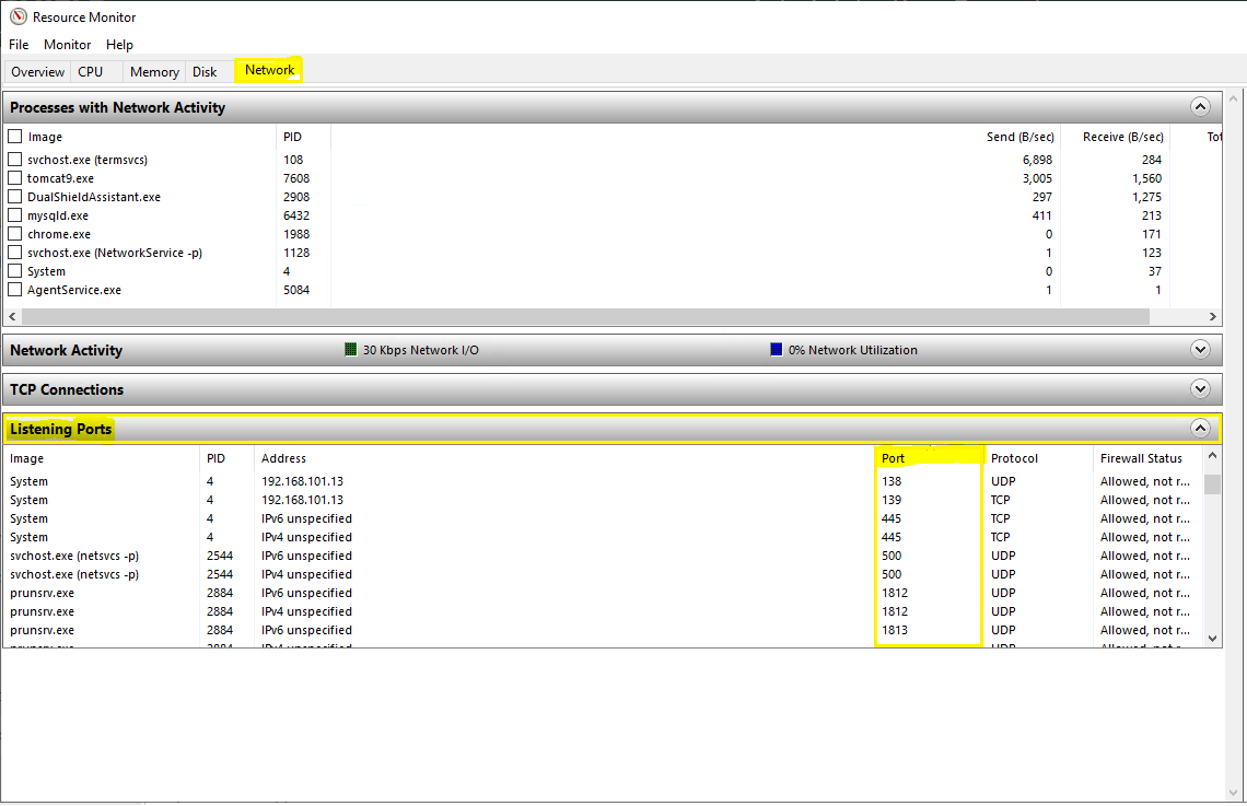 Select the "Network" tab in the main menu, then expand the section named "Listening Ports".