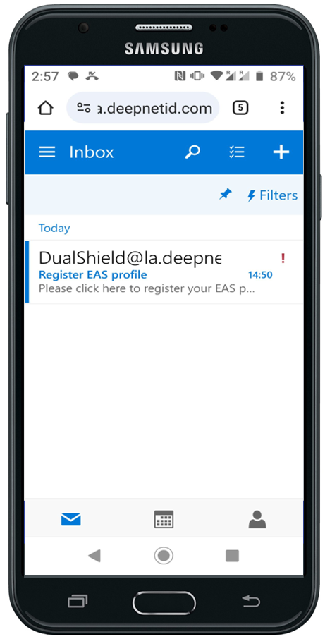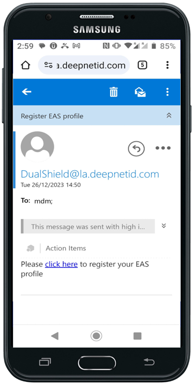 An Exchange ActiveSync (EAS) profile registration message will be sent to the user by email or SMS message.