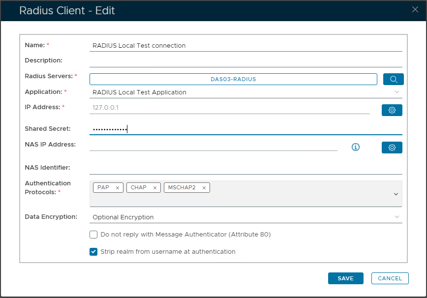 NTRadPing can be configured to act as a RADIUS Client, establishing a connection with the installed RADIUS Server.Step 1: In DualShield Administration Console, register NTRadPing as a RADIUS client: