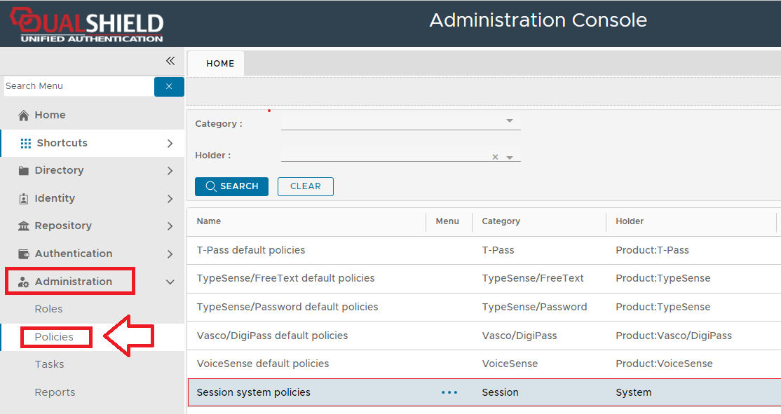 In general, the session policy is used to control sessions of the DualShield web consoles, such as the Admin Console (DAC), User Self-Service Console (DSC), etc.