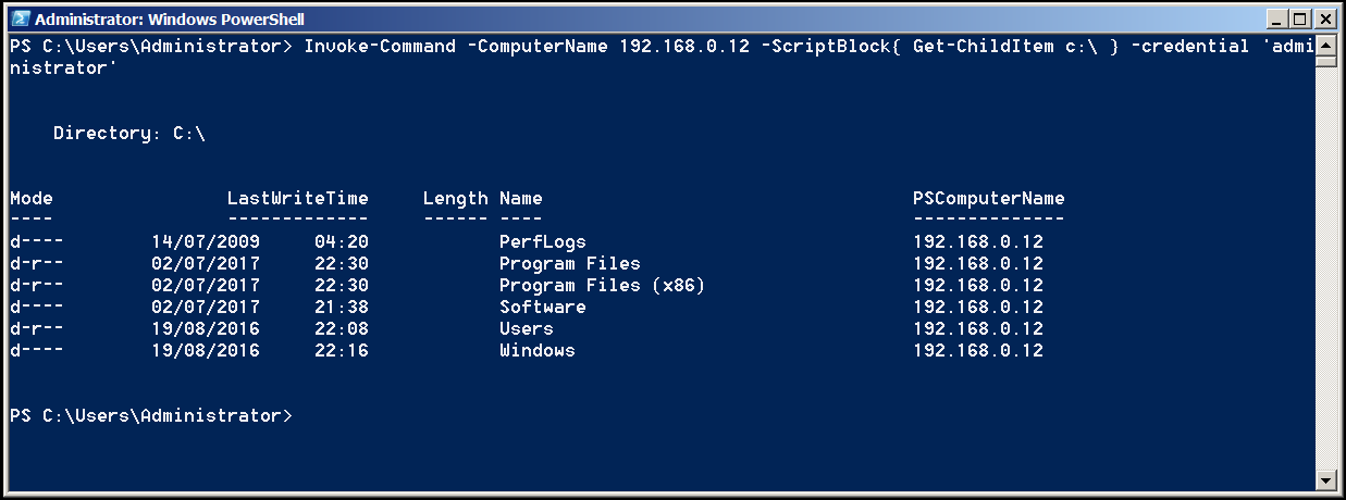 Invoke-Command -ComputerName COMPUTER -ScriptBlock { Get-ChildItem C:\ } -credential USERNAME