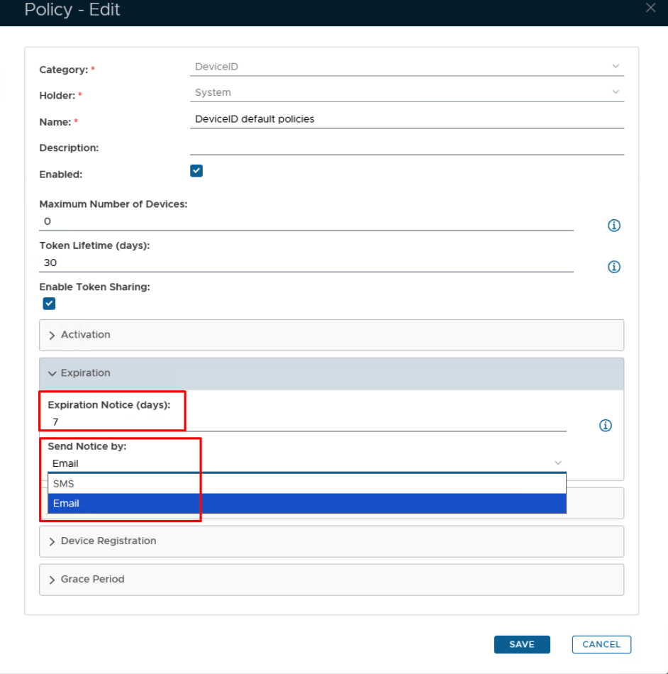 A token expiry notification may be sent based on the date of token creation and the value specified in the DeviceID policy setting "Expiration Notice (days):" (see below);