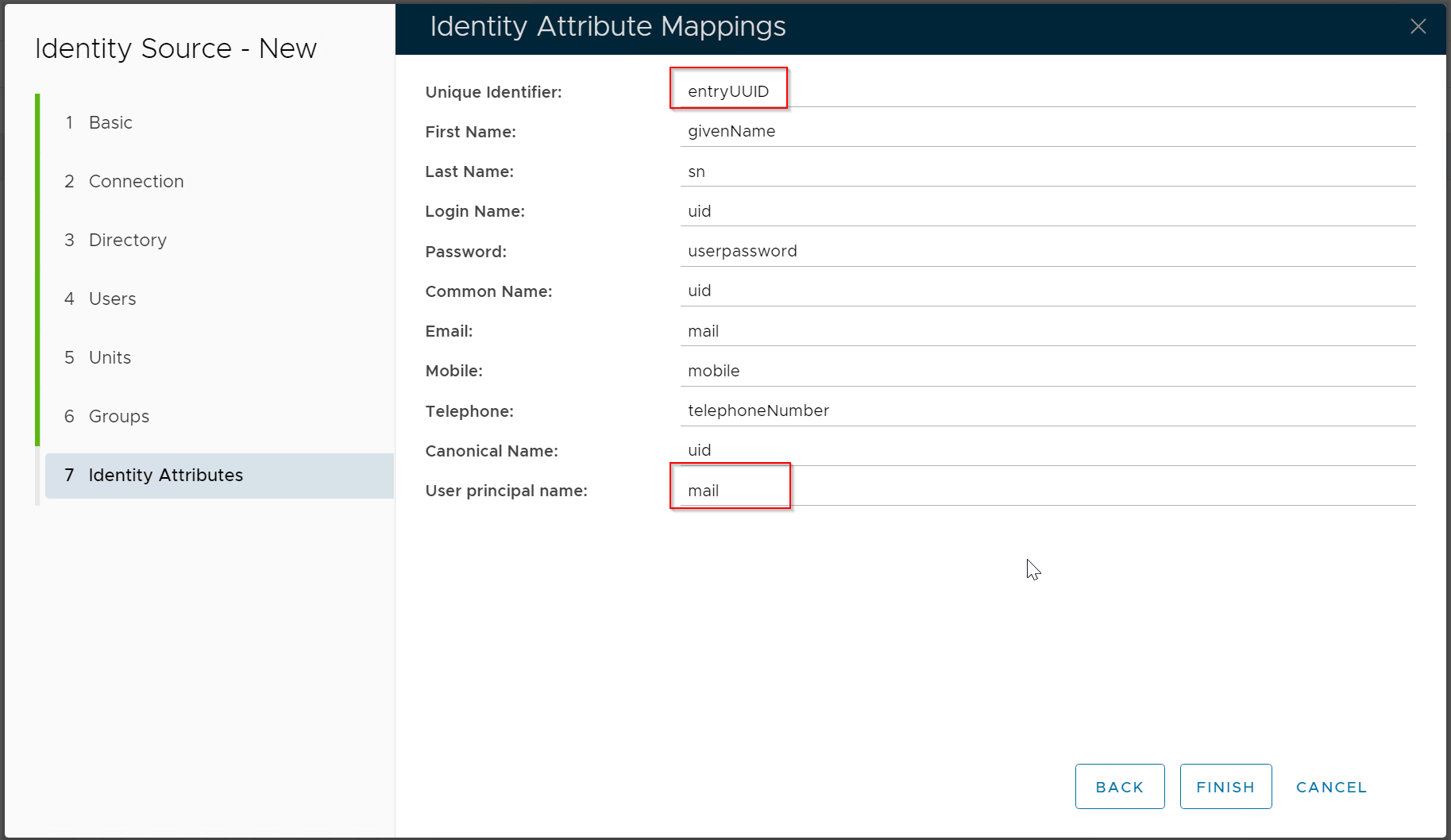 Change the value of Unique Identifier to "entryUUID" Change the value of User Principal Name to "mail" |