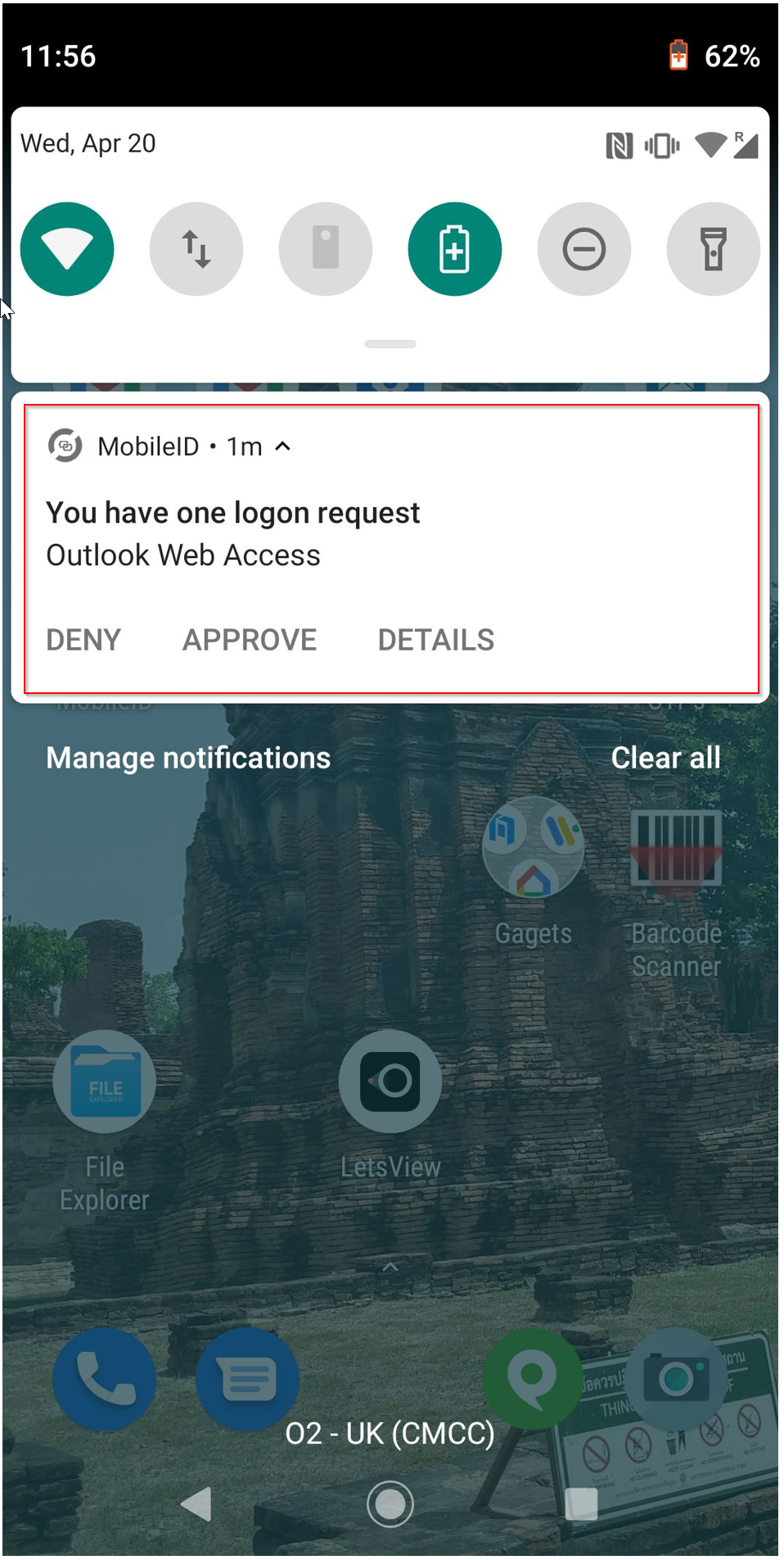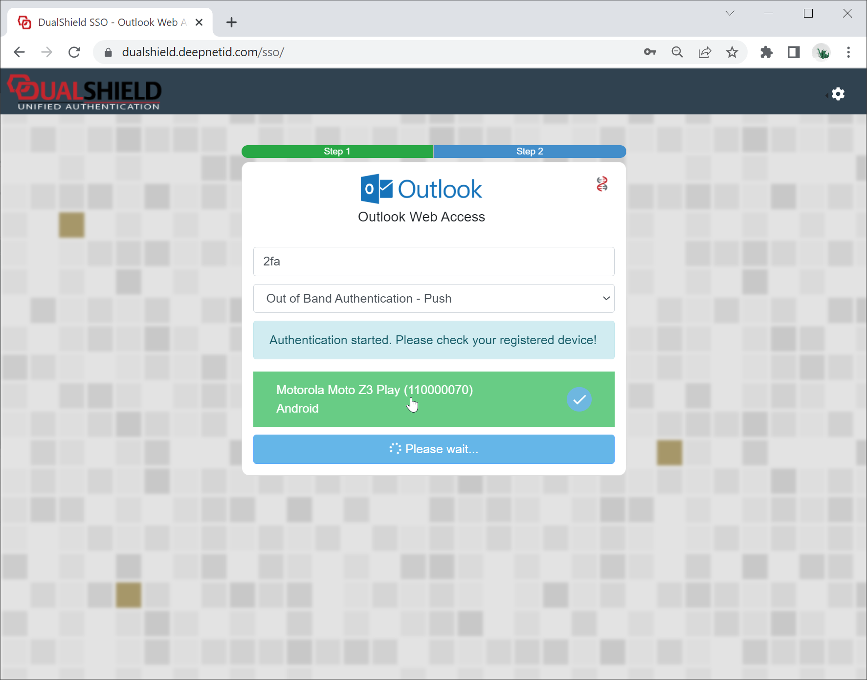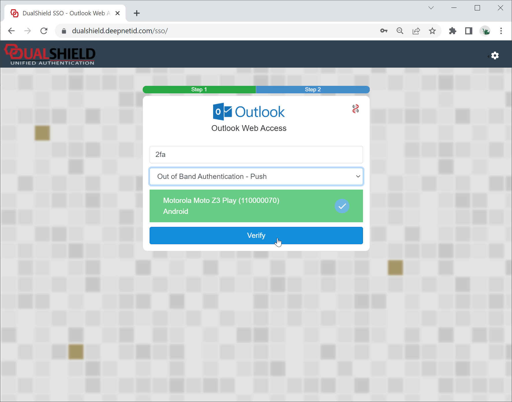 Launch a web browser and navigation to your application's logon page. Enter the username, select "Out of Band Authentication - Push" as the authenticator | |