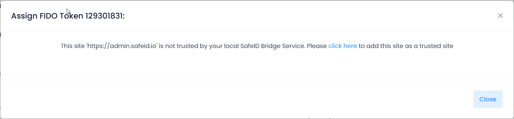 Once you have added the SafeID admin console as a trusted site to your local SafeID Bridge Service, click the "Close" button to dismiss the prompt. Then, click "Assign" in the token's action menu again.
