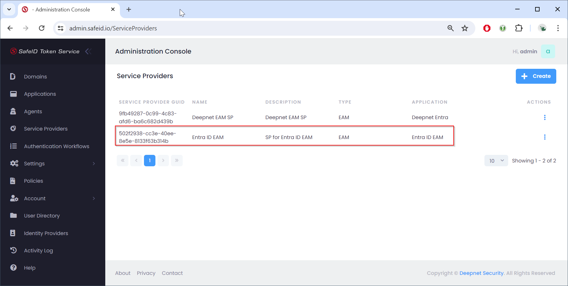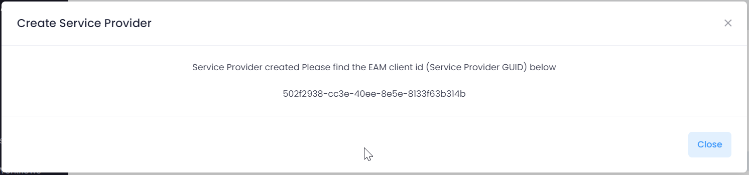 You will now be presented with confirmation of the service provider creation along with a GUID.