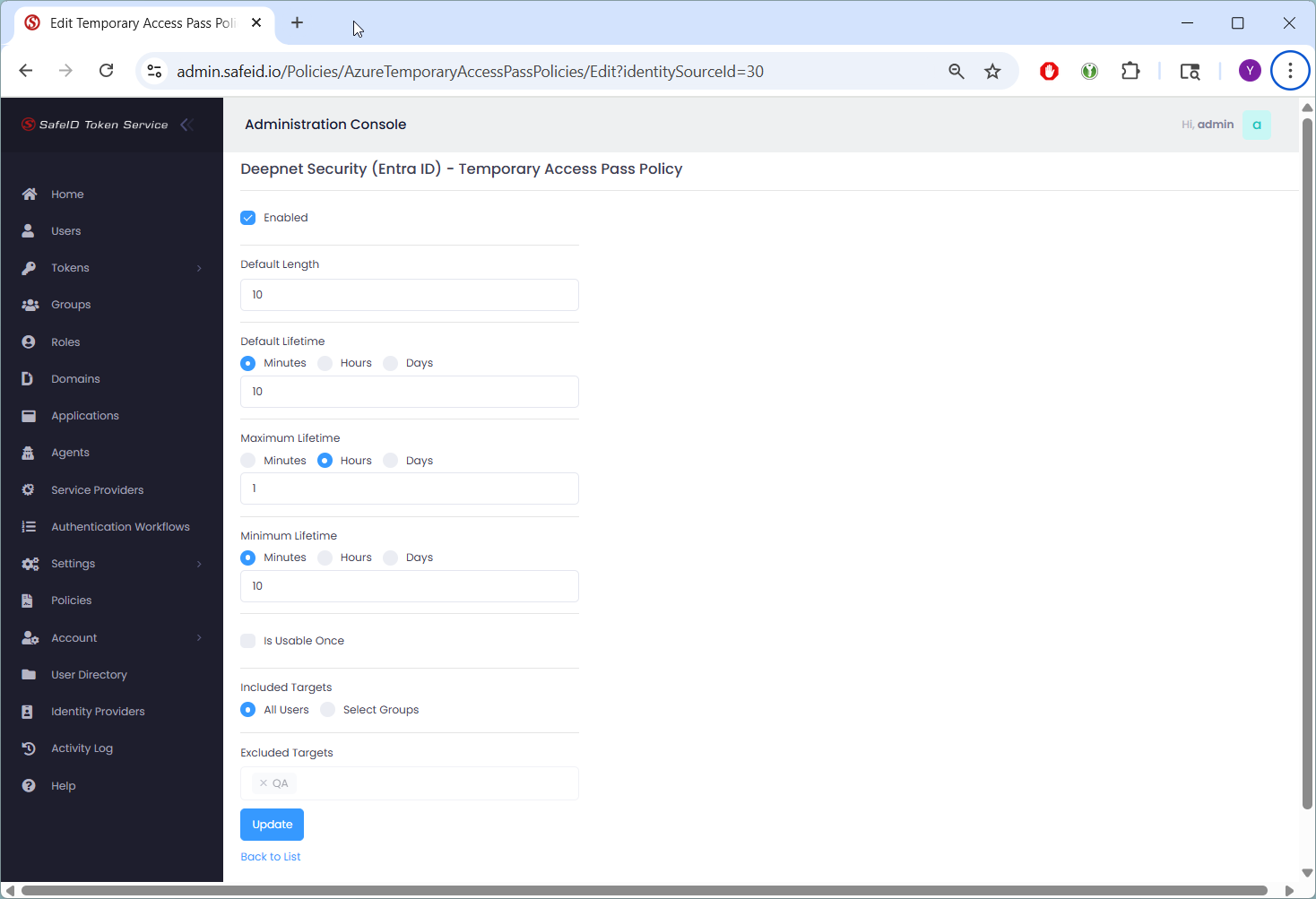 Click the Actions menu of the Temporary Access Pass policy to edit, and select "Edit" in the menu