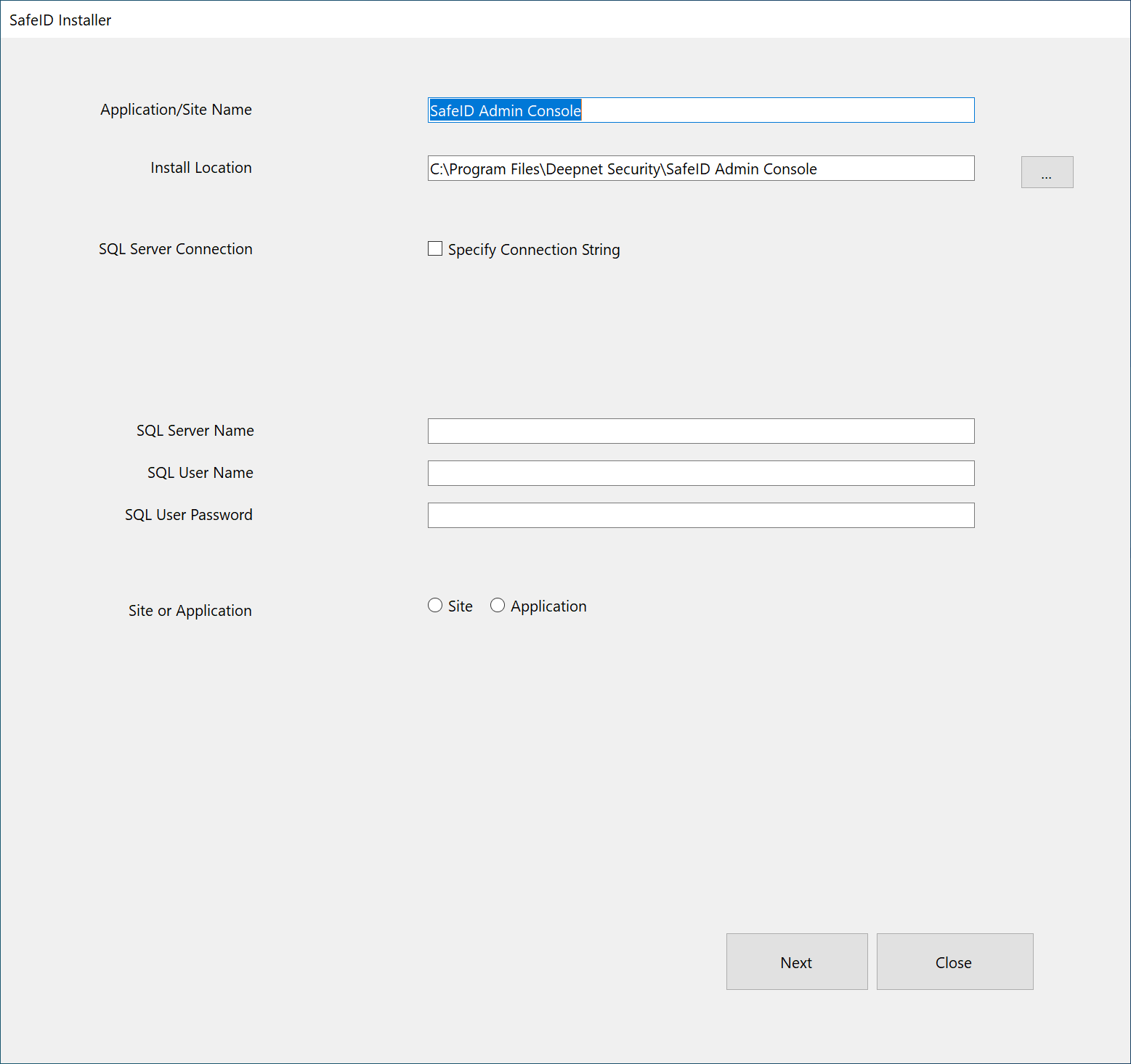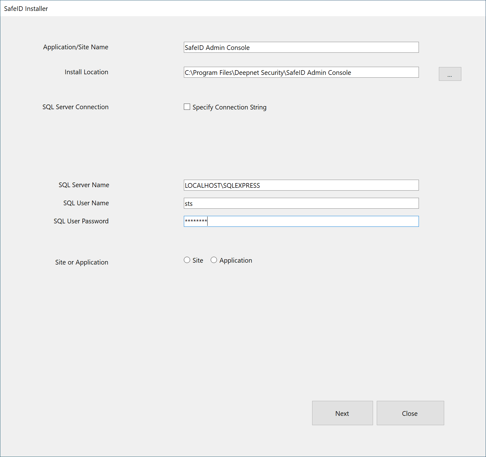 Select "Site" in "Site or Application" (This means that the SafeID Token service will be installed as a website in the local IIS web server)