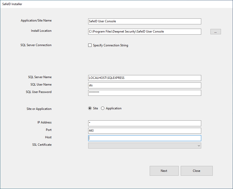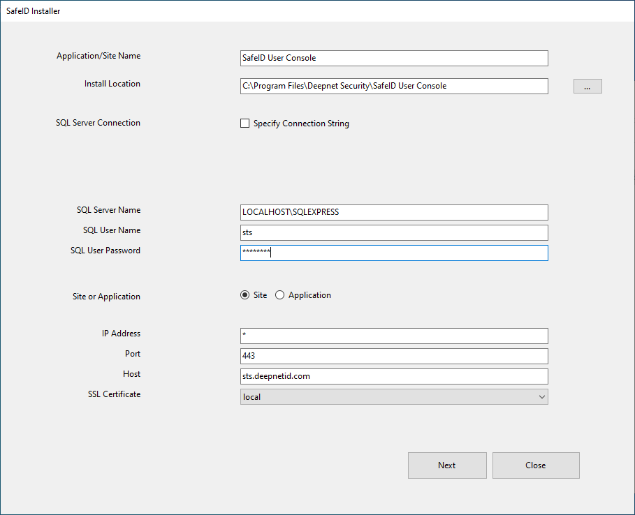 As the SafeID User Console will be accessed by your users, you need to provide an FQDN (Fully Qualified Domain Name) as its hostname.