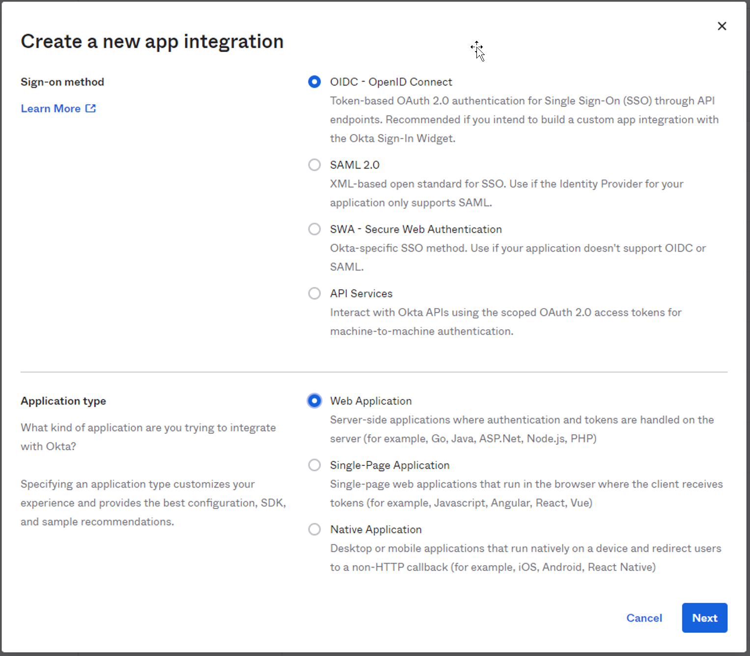 Select "OIDC - OpenID Connect" as the Sing-on method and select "Web Application" as the application type