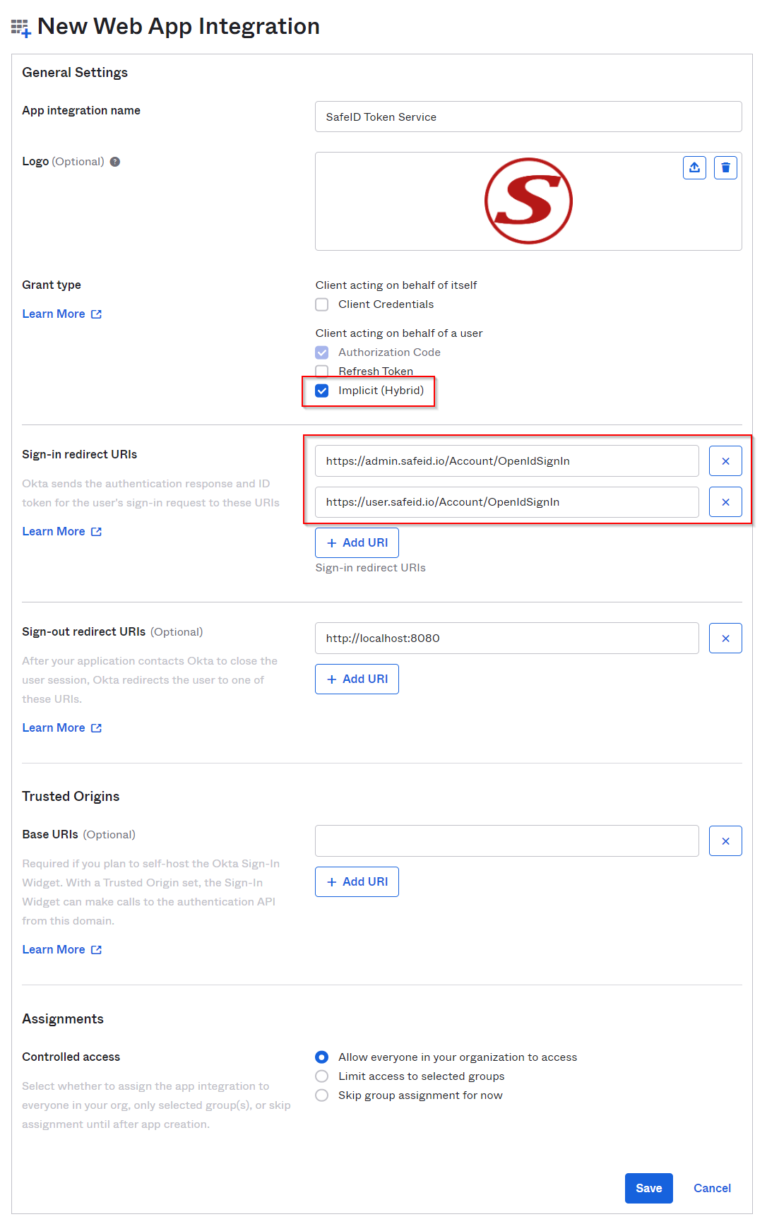 Enter a name, e.g. SafeID Token Service, into the New Web App Integration form,