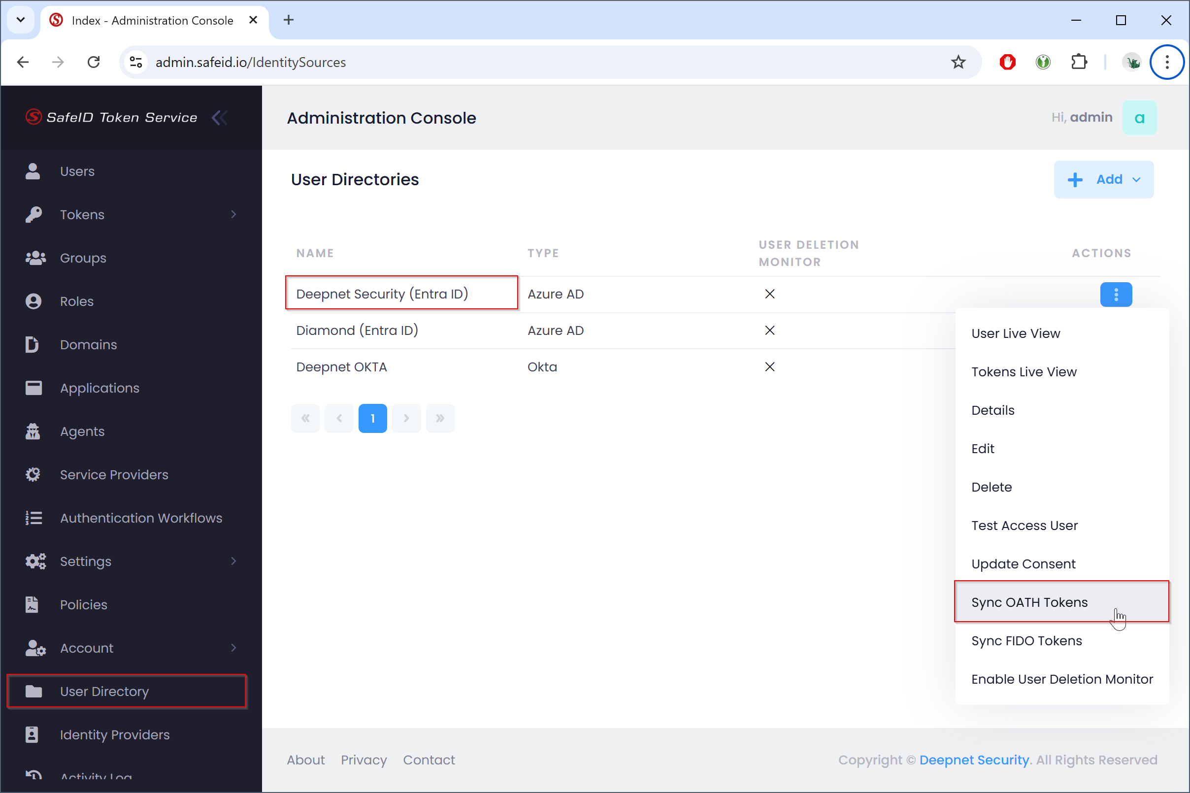 Click the Actions menu of the user directory that you want to synchronise with, then select "Sync OATH Tokens"