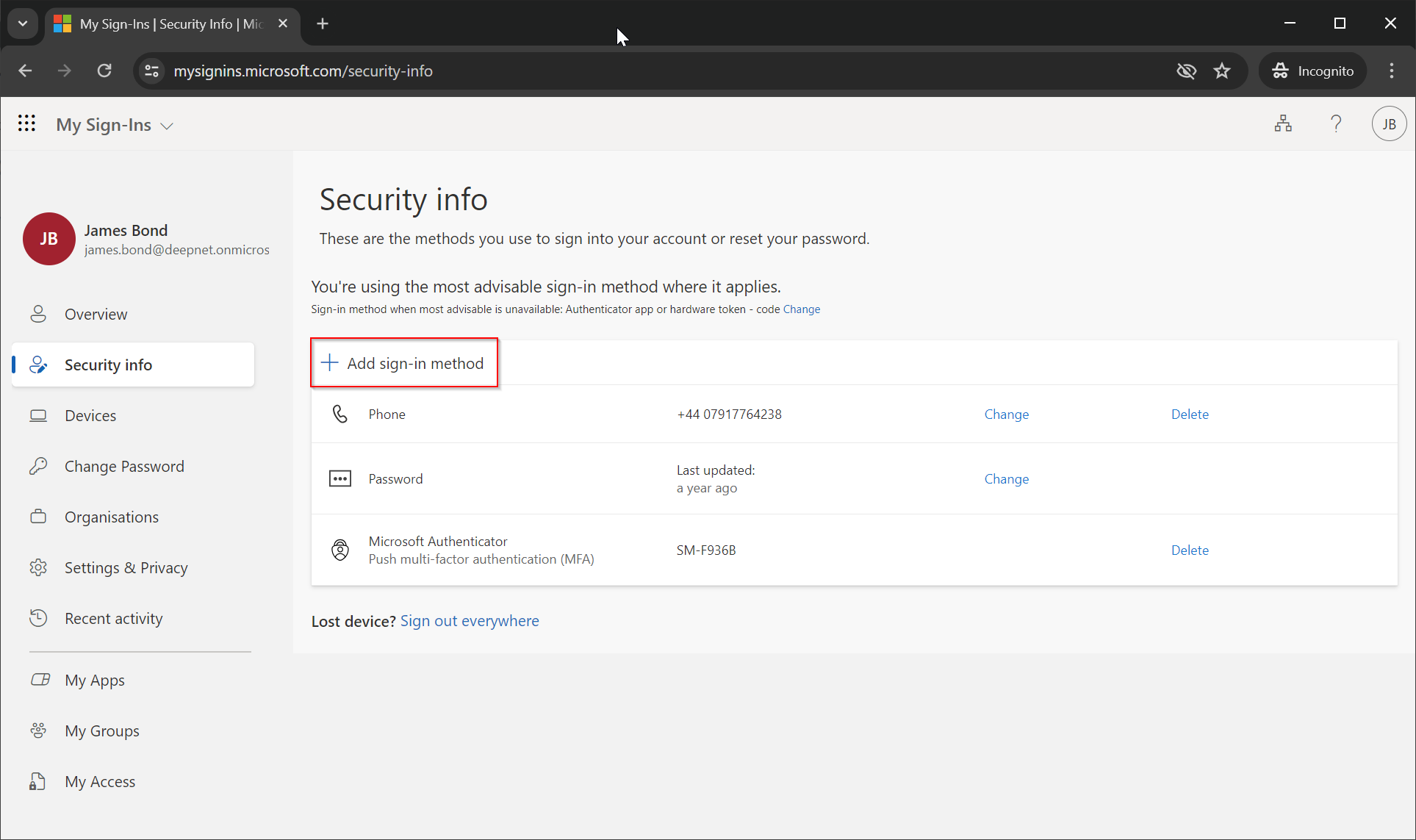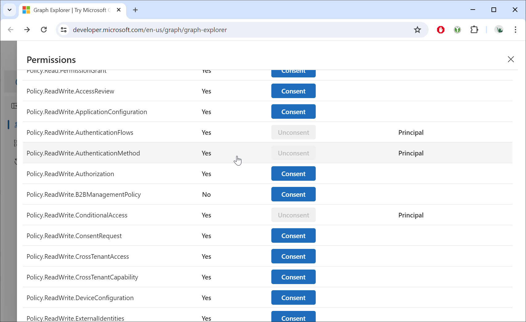 In the Permissions tab, find Policy.ReadWrite.AuthenticationMethod.