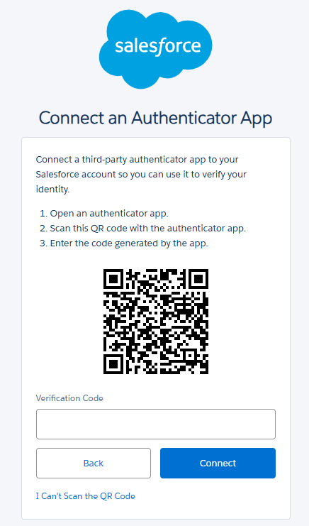 After enabling MFA on the Salesforce account you will be presented with a QR code (example below);