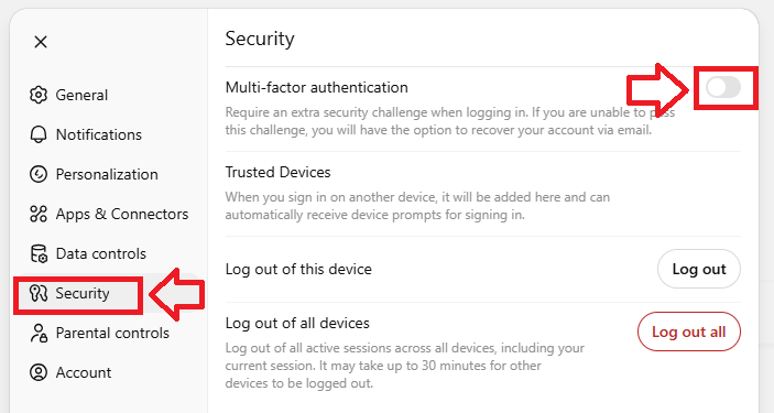 From the left hand column menu select "Security", then against the prompt "Multi-factor authentication" use the slider to enable this feature;