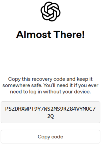 You will now be provided with a recovery code (example below);