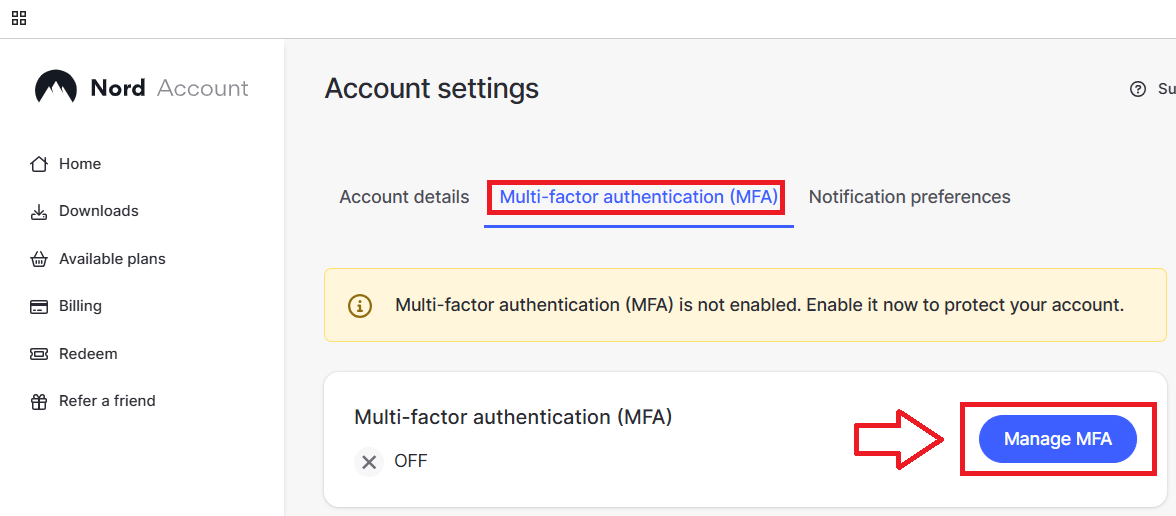 A new window titled "Account Settings" will now open, select the sub-section "Multi-factor authentication (MFA)", then click on the button ;