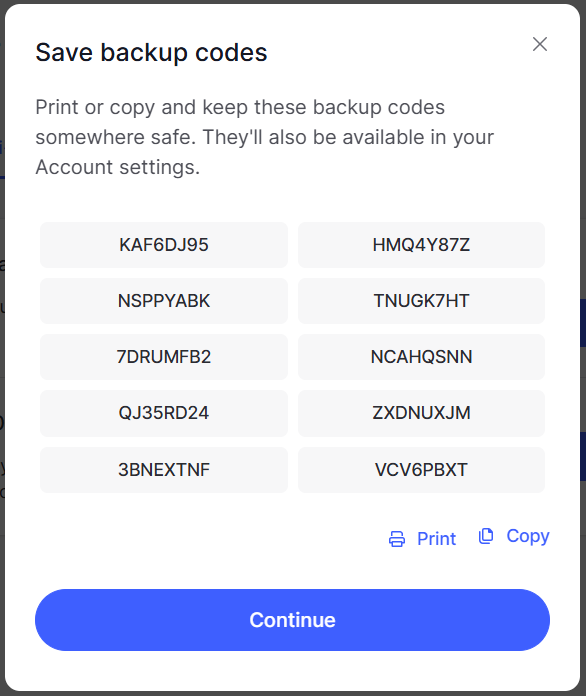 Backup codes will be generated for you, and it is a good idea to keep a record of these (as a backup entry method);