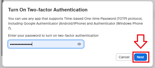 A window will now open titled "Turn on Two-factor Authentication", enter your password then click .