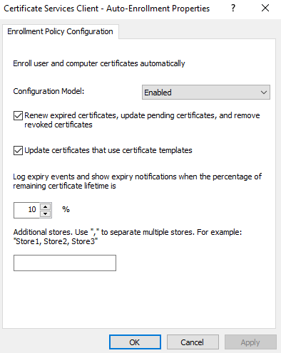 - Right-click Certificate Services Client – Auto-Enrollment Policy and select Properties and make changes as below: