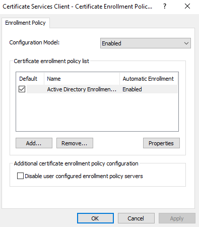 - Right-click Certificate Services Client – Certificate Enrollment Policy and select Properties.
