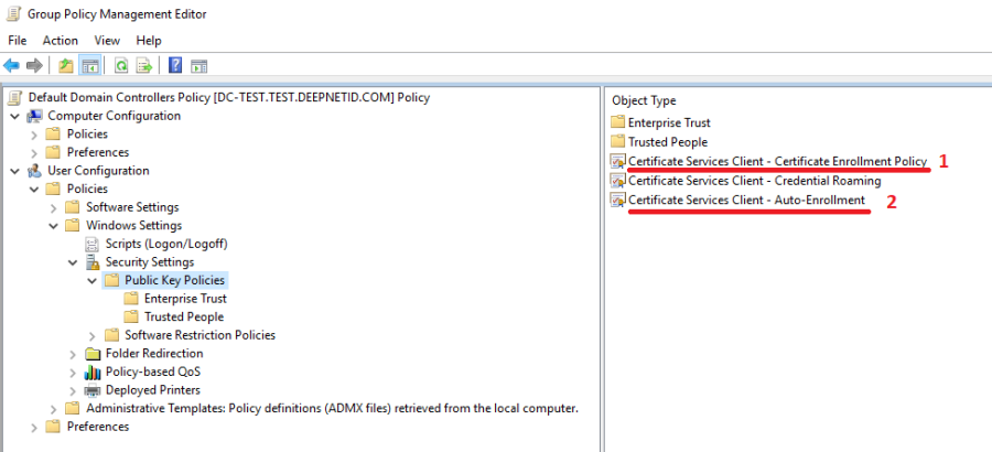 - Expand User Configuration > Policies > Windows Settings > Security Settings > Public Key Policies. Apply same changes to same polices.