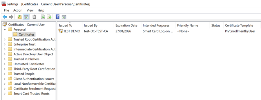 - Check the windows certificate store, the new cert is also stored in the cert store, as well as the smart card token.