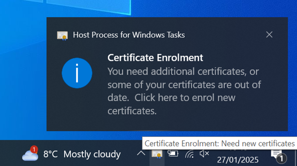 - Click the Certificate Enrollment notification to open the Certificate Enrollment wizard. If the popup has disappeared (or didn't initially appear) click the arrow in the System Tray to expand the list of options and click on the certificate icon.