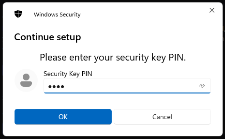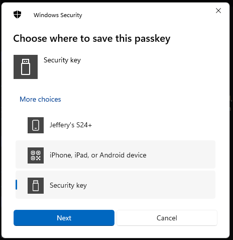 You will then be asked to select where to save the passkey, select "Security key", then click