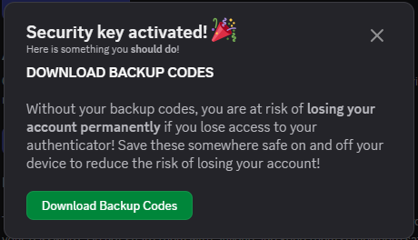 At this stage you are strongly advised to download the backup codes (as a form of emergency access should Discord have difficulty using your key, or if you key is lost);