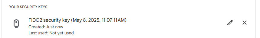 If you now return to your Google Account passkeys and security keys settings, you will find that the new FIDO2 security key has been added as a newly registered passkey;