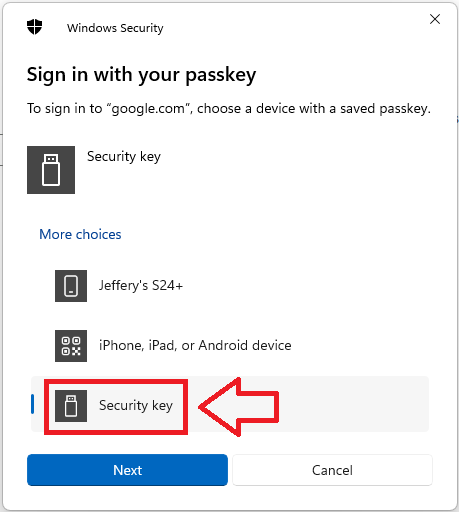 Insert you Fido2 key into an available USB port then select "Security Key";