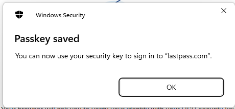 Provided you press the button on the Fido2 key in the allowed time, the passkey details will be stored on your Fido2 key, and you will be presented with the following confirmation;